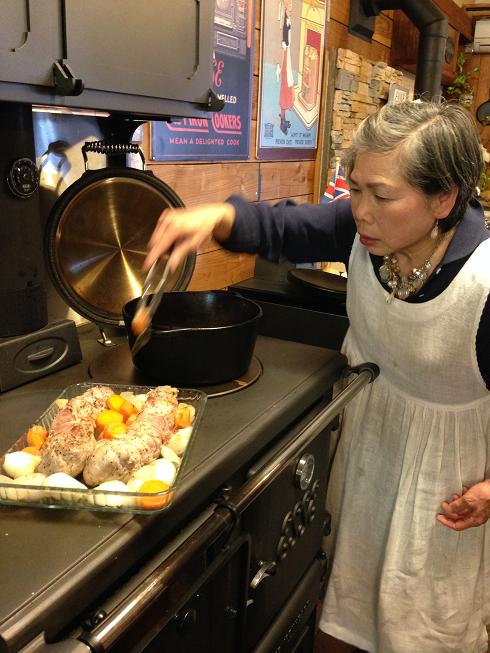 薪ストーブのオーブンでお肉を焼いて、野菜は薪ストーブの上でコトコト煮込みました。